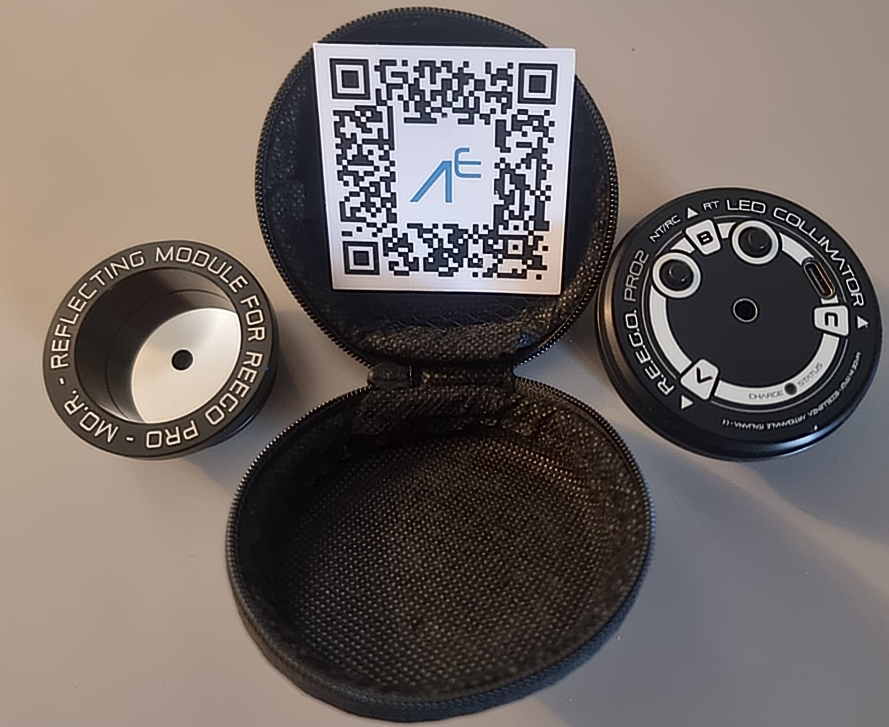 Il collimatore ha due set di LED, i classici led rossi per la collimazione dei riflettori e quattro led bianchi per la collimazione dei rifrattori, la batteria di alimentazione dei led può essere ricaricata tramite cavo USB-C. Il collimatore viene fornito all’interno di una pratica custodia su misura con cerniera.