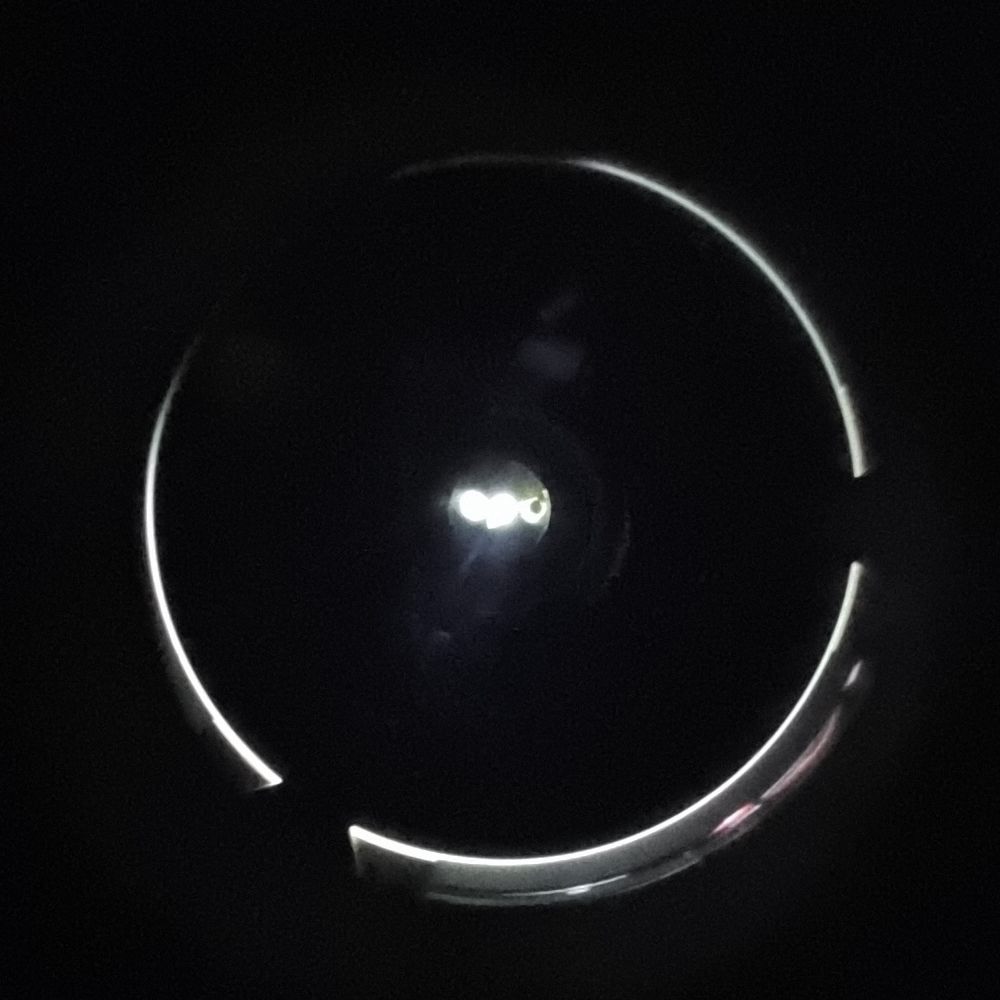 Nella Figura 3 è mostrato il dettaglio di ciò che si osserva grazie al MO.R. dopo aver collimato il telescopio con il laser e aver successivamente rifinito l’allineamento con il REEGO. Nel mio caso il riferimento centrale del primario è traslucido e viene illuminato posteriormente con una torcia. A causa di un lieve disallineamento del secondario, compaiono più riflessi del riferimento, visibili a destra e a sinistra dell’immagine principale.
